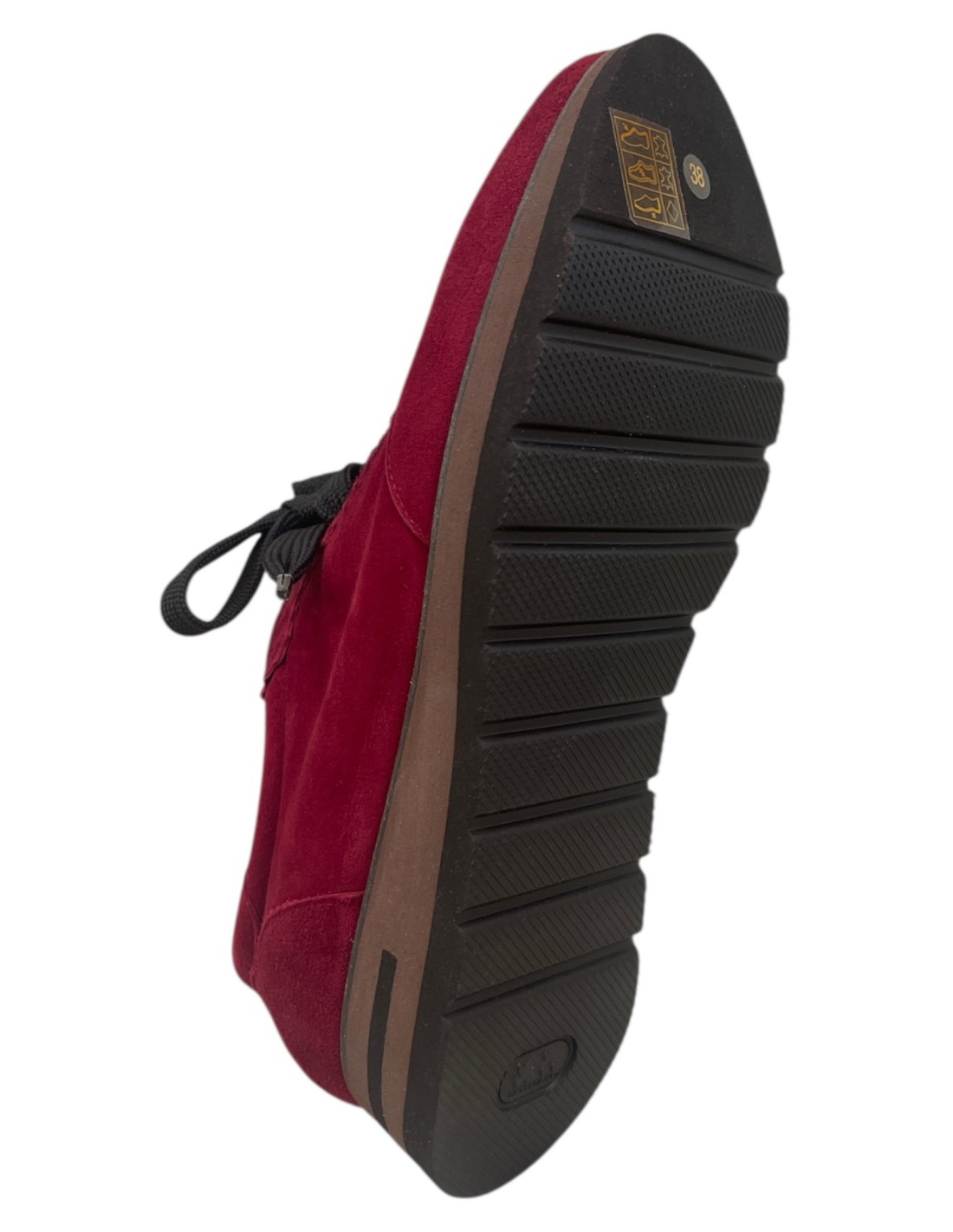 BettinScarpa sportiva allacciata in camoscio bordeaux, fondo gomma leggera (non flessibile), fodera in pelle. Mezze misure dal 36 al 41. Prodotta artigianalmente nella provincia di Padova.